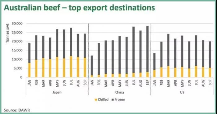 2018年,澳大利亚三大牛肉出口目的地,按数量计算排名前三依次是日本(351,891吨,占出口总量的28.1%),其次是美国(230,362吨,占出口总量的20.5%)和韩国(170,373吨,占出口总量的15.1%)。但今年以来,澳洲牛肉三大出口目的地变为日本、中国和美国。