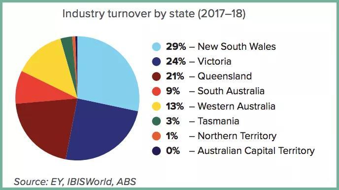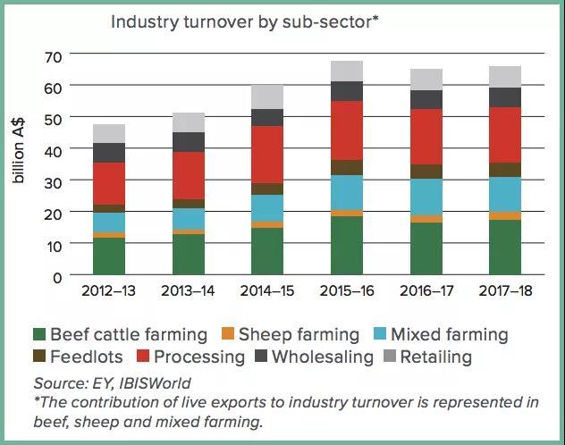 2017-18财年,澳大利亚的牛羊肉及畜牧业创造GDP超过185亿澳元,带动就业40.48万人(直接就业人口17.2万人),产生的行业收入突破657亿澳元,出口价值133亿澳元。其中,新州、维州和昆州是澳洲牛羊肉产业最为发达区域,产出比例占全澳的29%、24%和21%。