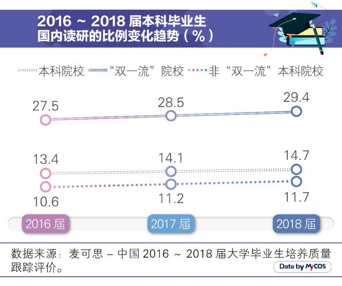 其中,“双一流”院校2018届毕业生国内读研的比例为29.4%,非“双一流”本科院校2018届毕业生国内读研的比例为11.7%。