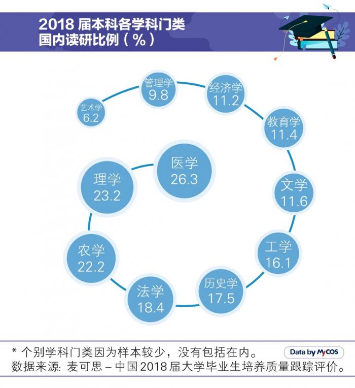 从本科学科门类来看,医学类毕业生国内读研比例最高,为26.3%;第二位是理学类,为23.2%。