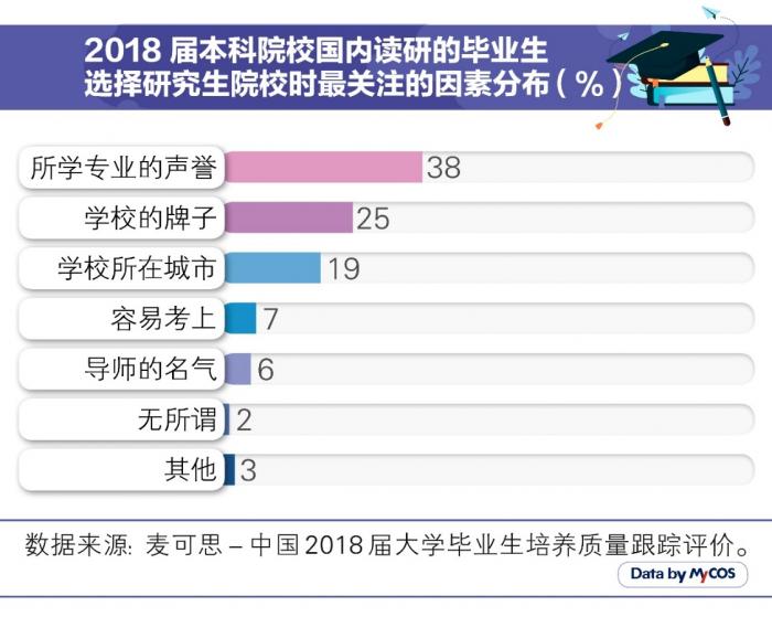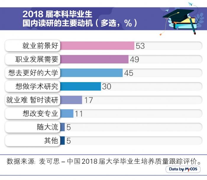麦可思数据显示,2018届本科毕业生国内读研的主要原因是硕士研究生就业前景好(53%)和职业发展需要(49%)。读研人群选择院校时最关注的因素是所学专业的声誉(38%)和学校的牌子(25%)。