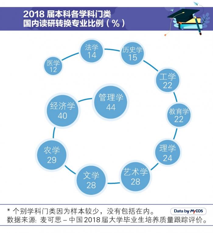 在2018届国内读研的本科毕业生中,有27%的人转换了专业。其中,从学科门类来看,2018届管理学类本科毕业生读研转换专业的比例最高,为44%,经济学类次之(40%)。而国内读研比例最高的医学类毕业生转换专业的比例最低,为12%。