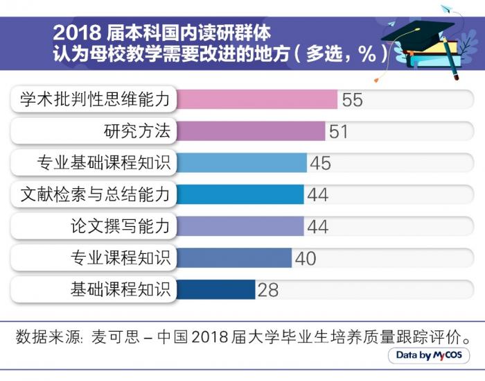 麦可思数据显示,55%的读研本科生认为“学术批判性思维能力”亟待改进,其次是“研究方法”(51%)。