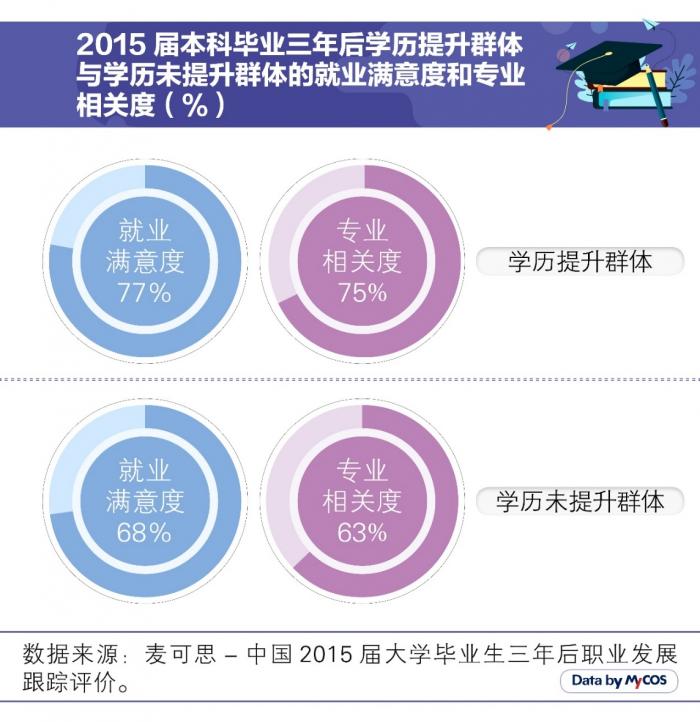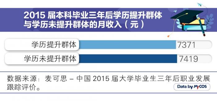 麦可思数据显示,2015届本科毕业三年后学历提升群体(获得国内硕士学历的群体)月收入为7371元,反而不如未考研的2015届本科毕业生工作三年后的月收入(7419元)。