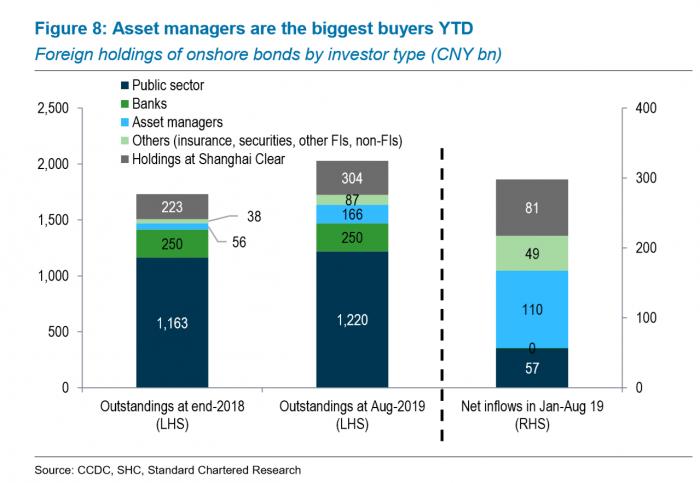 2019年前8个月,全球资产管理公司占外资持有中国债券净买入量的51%,达1100亿人民币,超过了公共领域的26%(包括海外央行,海外主权财富基金及多边金融机构)。