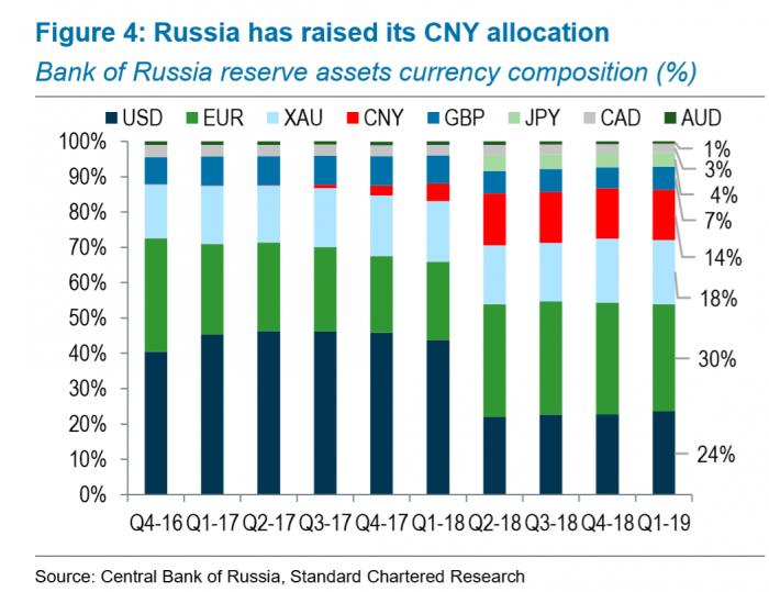 报告指出,全球已经有45家央行宣布直接或间接持有人民币储备资产。其中,俄罗斯央行是全球增持人民币资产规模最大的央行。从2018年初至2019年一季度末,俄罗斯央行增持了570亿美元的人民币资产储备。其持有的人民币资产占到了目前全球人民币储备资产的的三分之一。