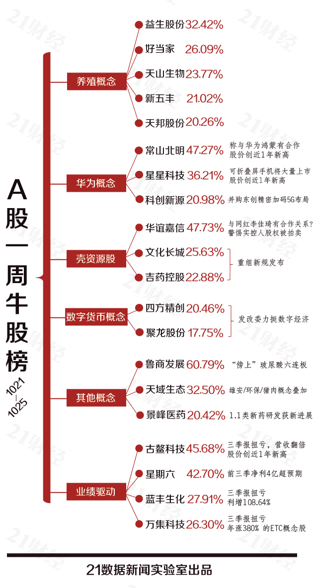 纵观本周20大牛股,主要集中在养殖、华为、数字货币、壳资源股等概念上。