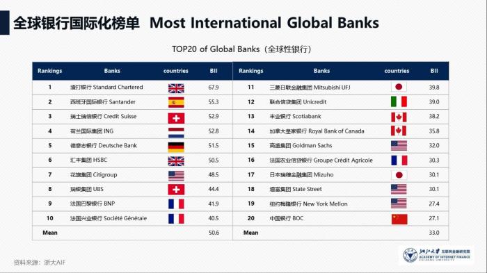 报告称,全球银行国际化榜单中位居榜首的是渣打银行,其次是西班牙国际银行和瑞士瑞信银行。前十名银行均来自发达国家,欧洲各国因其天然区位优势,国际化水平更高,包揽全球性银行国际化前5名。
