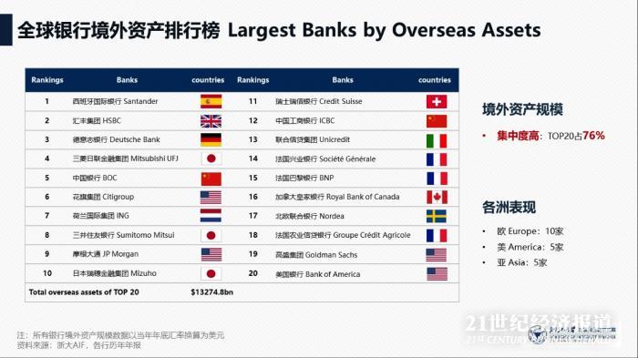 境外资产规模排行榜中,有两家国有大行,中国银行位于第五,工商银行位于第12。