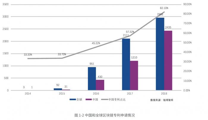 但是,从全球专利申请量的变化趋势来看,区块链领域专利申请数量上涨但增幅逐渐放缓,从2015年约3000%的涨幅降到2018年的40%。
