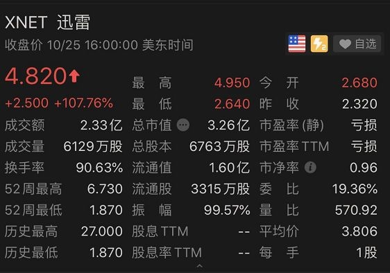 一夜之间,区块链中概股集体大涨,其中迅雷更是翻倍。