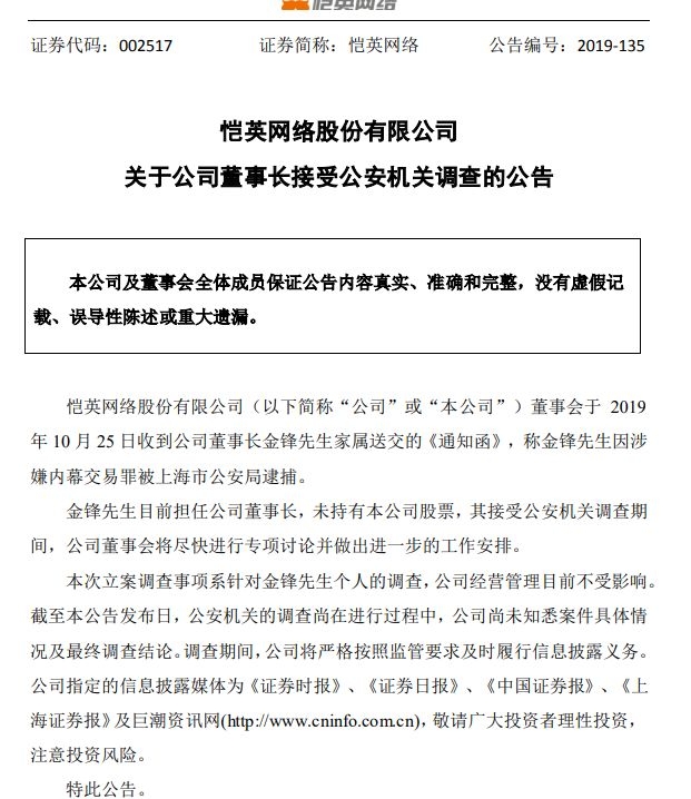 25日晚间,恺英网络发公告称,收到公司董事长金锋先生家属送交的《通知函》,称金锋先生因涉嫌内幕交易罪被上海市公安局逮捕。
