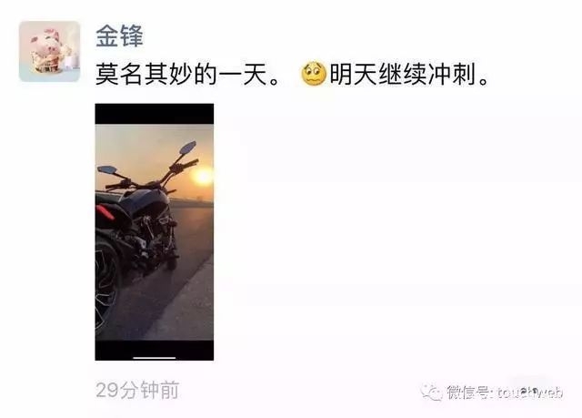 当时他还发了朋友圈,一条朋友圈是冲刺5月,配上了公司团队工作照片,另一条则晒了一台夕阳下的摩托,称“莫名其妙的一天,明天继续冲刺”。