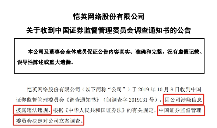 10月8日晚间,恺英网络公告,因公司涉嫌信息披露违法违规,证监会决定对公司开展立案调查。