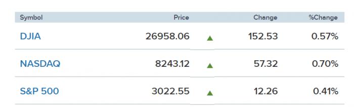 截至收盘,标普500指数攀升0.4%至3022.53点,盘中一度短暂突破历史纪录高点。道琼斯工业指数上涨0.57%,报26958.06点;纳斯达克指数上涨0.70%,报8243.12点。道指、标普500指数与纳指的最高收盘纪录分别为27359.16点、3025.86点和8330.21点,三大指数距离突破纪录仅一步之遥。