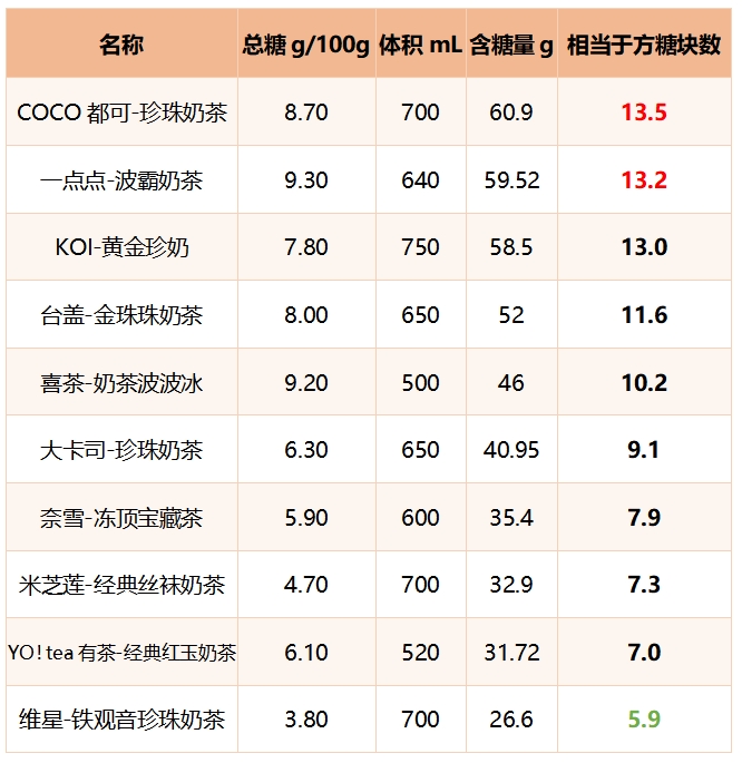 按每款奶茶的总体积算出它们各自的总糖值,10款珍珠奶茶每杯总糖值范围为:26.6g~60.9g。以每块方糖4.5g计算,一点点波霸奶茶单位总糖含量最高,每杯总糖量约为13.2块方糖量。维星铁观音珍珠奶茶单位总糖含量最低,每杯总糖量约为5.9块方糖量。
