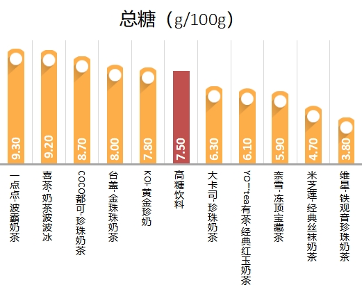 本次测评的10款珍珠奶茶中,5款属于高糖饮料,其中一点点波霸奶茶总糖含量最高(9.30g/100g),维星铁观音珍珠奶茶总糖含量最低(3.8g/100g)。