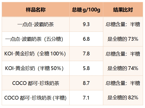 好问题!为了进一步了解珍珠奶茶的糖分情况,我们测评了三款奶茶全糖和半糖的总糖值,结果发现:所谓的全糖与半糖并不成1/2比例,而是全糖奶茶的七成至八成含糖量。
