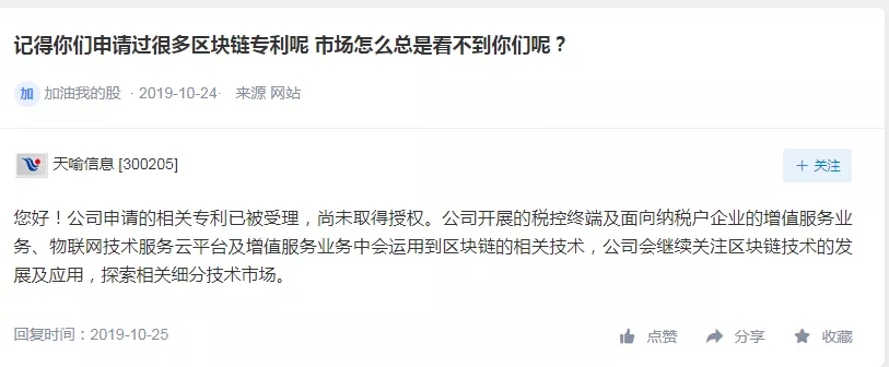有投资者问天喻信息(300205.SZ),“记得你们申请过很多区块链专利呢,市场怎么总是看不到你们呢?”天喻信息回应称,公司申请的相关专利已被受理,尚未取得授权。公司开展的税控终端及面向纳税户企业的增值服务业务、物联网技术服务云平台及增值服务业务中会运用到区块链的相关技术,公司会继续关注区块链技术的发展及应用。