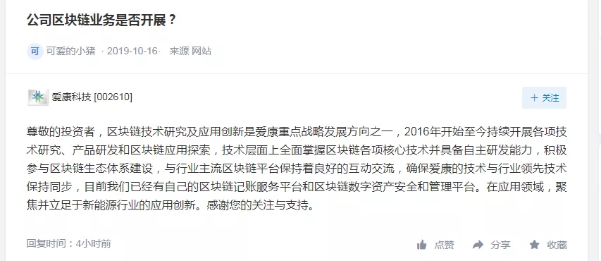 其中,有不少上市公司给予了明确回应。比如爱康科技(002610.SZ)回应称,区块链技术研究及应用创新是爱康重点战略发展方向之一,2016年开始至今持续开展各项技术研究、产品研发和区块链应用探索,技术层面上全面掌握区块链各项核心技术并具备自主研发能力。
