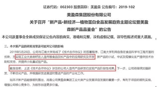 这可不是普通的人造肉,而是加了大麻麻籽的人造肉。美盈森公告显示,此次展示的产品是公司今年5月开始的工业大麻麻籽在人造肉产品的应用研究的产品阶段性成果。