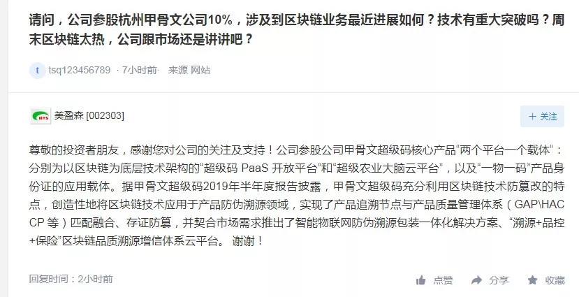 小编发现,除了美盈森,这个周末还有不少上市公司因为区块链忙碌起来,无数投资者正在互动平台向上市公司发问,“涉及区块链了吗?”“准备发展区块链吗?”
