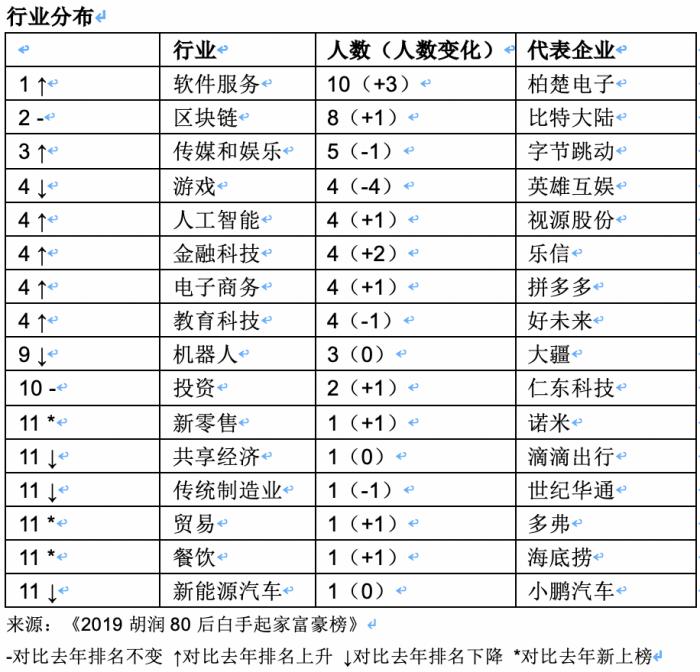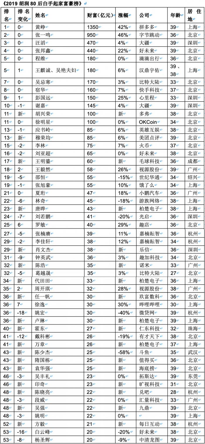 10月28日,胡润研究院发布《2019胡润80后白手起家富豪榜》(Hurun Under 40s China Rich List 2019),这是胡润研究院连续第四次发布此榜单,财富计算的截止日期为2019年8月15日。该榜单为胡润研究院10月10日发布的《2019 LEXUS雷克萨斯•胡润百富榜》的子榜单。