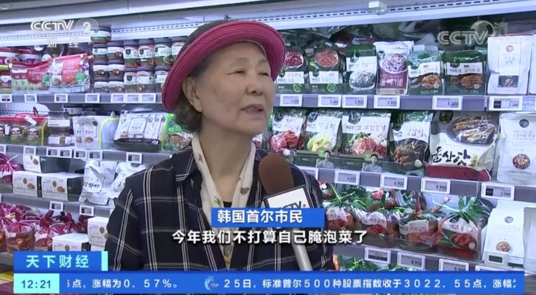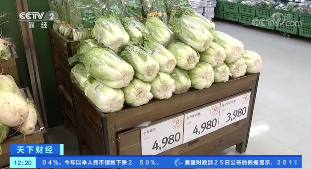 白菜的零售价格同样也在暴涨。央视财经记者在韩国首尔市中心的一家大型超市了解到,一棵不到两公斤的白菜,价格是5000韩元,相当于人民币30元,是去年这个时候价格的两倍。