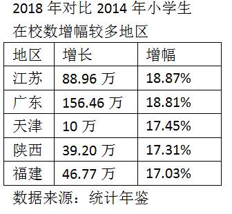 统计年鉴数据显示,对比2014年和2018年小学生的在校数量,江苏、广东、天津、陕西、福建的增幅都超过17%。很多地方小学生数量仍然在持续增长,以2016年数据对比2018年,广东、山东、江苏、河北等地的小学生在校数量均超过30万人,其中广东超过80万人。
