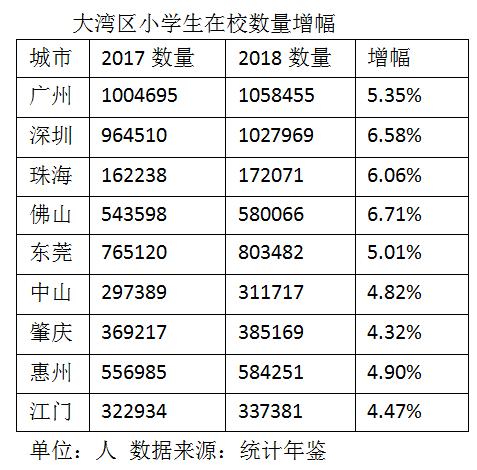 以2018年和2017年数据对比,大湾区9个城市的小学生在校数量均有超过4%的增幅,其中佛山、深圳和珠海增幅超过6%。