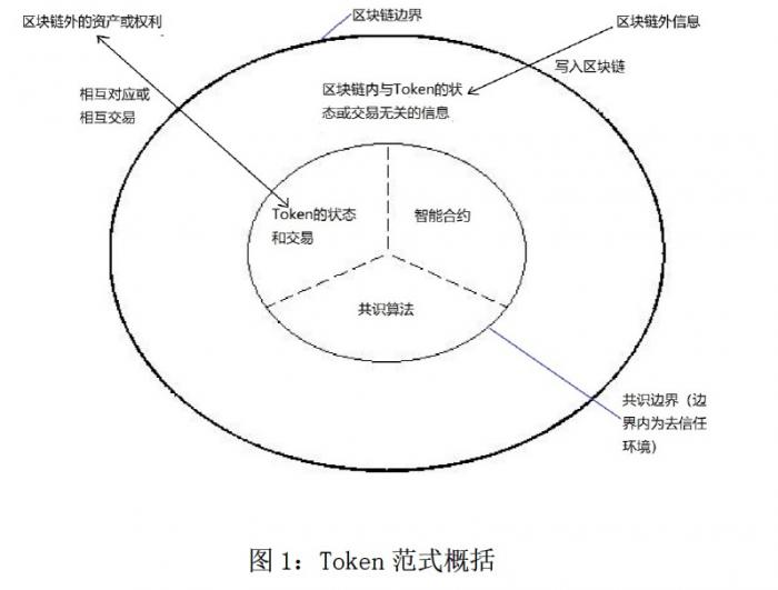 图1 概括了以上对Token 范式的讨论。其中,Token、智能合约和共识算法都处于共识边界内,Token 与智能合约之间有密不可分的联系,共识算法确保了共识边界内的去信任环境。区块链内与Token 的状态或交易等无关的信息处于共识边界以外、区块链边界以内。区块链内外存在两类交互:一是区块链外信息写入区块链内;二是Token 与区块链外的资产或权利之间的相互交易(即市场共识,见第三部分第二小节对Token 的价格特征的讨论)或相互对应(见第三部分第一小节对区块链第二类应用的讨论)。