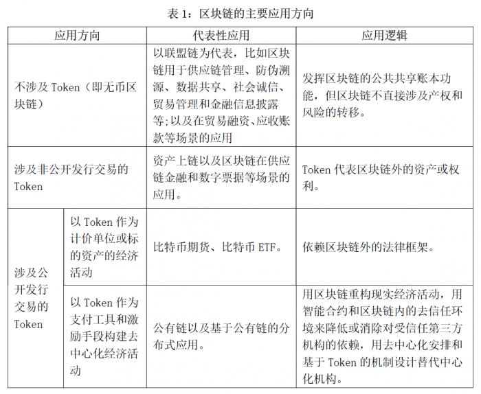 基于“Token”范式,本文分析了区块链的4 类主要应用方向:1.无币区块链。这类应用发挥区块链的公共共享账本功能以提高劳动分工协作效率,不直接涉及产权和风险的转移,面临的主要问题是如何保证区块链外信息在源头和写入区块链环节的真实准确性。联盟链因为仅对授权节点开放并依靠现实世界的约束,比公有链更适合这类应用。