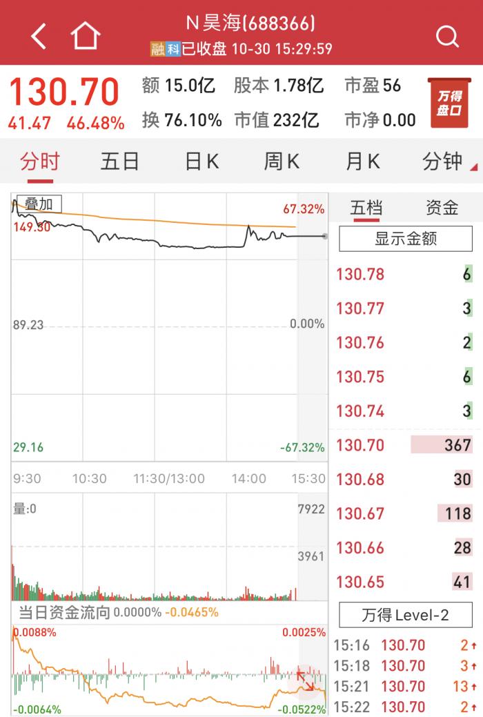 开盘价为每股149.30元,较发行价89.23元/股上涨67.32%。截至30日收盘,报收130.7元/股,收窄至46.48%。