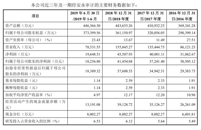 2016年、2017年、2018年及2019年1-6月,主营业务收入分别为85,862.29 万元、135,302.70万元、155,569.54万元和78,370.96万元,2016年至2018年年均复合增长率为34.60%,主要由眼科产品及整形美容与创面护理产品销售收入快速增长带动。