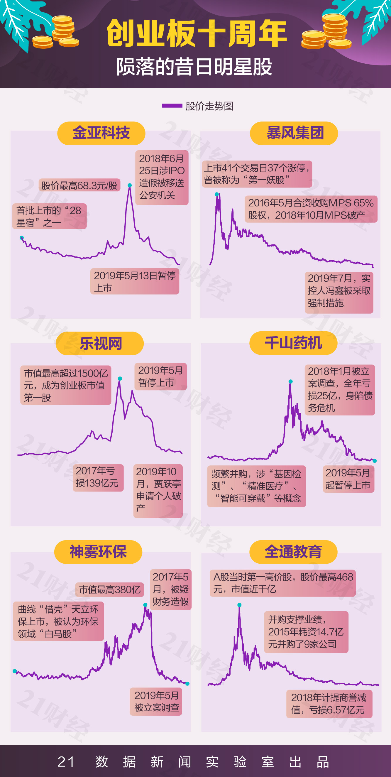 据21数据新闻实验室统计,截至2019年10月29日,共有6家创业板公司上市以来涨幅超过10倍,36家涨幅超过5倍。