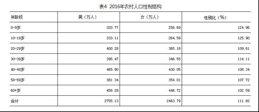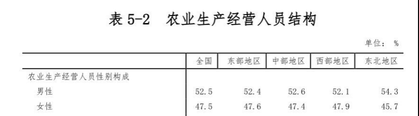 根据国家统计局2018年7月公布的第三次全国农业普查全国和省级主要指标汇总数据,全国农业生产经营人员31422万人,其中男性16494万人(占比52.5%),女性14927万人(占比47.5%),男性比女性多出1567万。在东北地区,农业生产经营人员男性占比(54.3%)要比女性(45.7%)高出8.6个百分点,男女失衡现象最为严重。