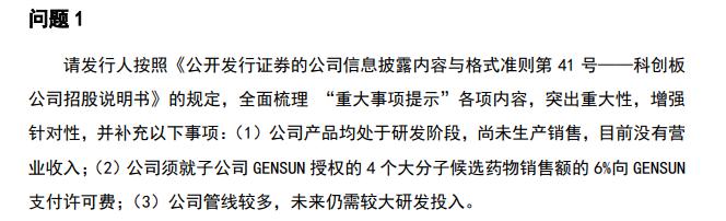 要求泽璟生物按照《公开发行证券的公司信息披露内容与格式准则第 41 号——科创板 公司招股说明书》的规定,全面梳理 “重大事项提示”各项内容,突出重大性,增强 针对性,并补充以下事项:(1)公司产品均处于研发阶段,尚未生产销售,目前没有营 业收入;(2)公司须就子公司 GENSUN 授权的 4 个大分子候选药物销售额的 6%向 GENSUN 支付许可费;(3)公司管线较多,未来仍需较大研发投入。
