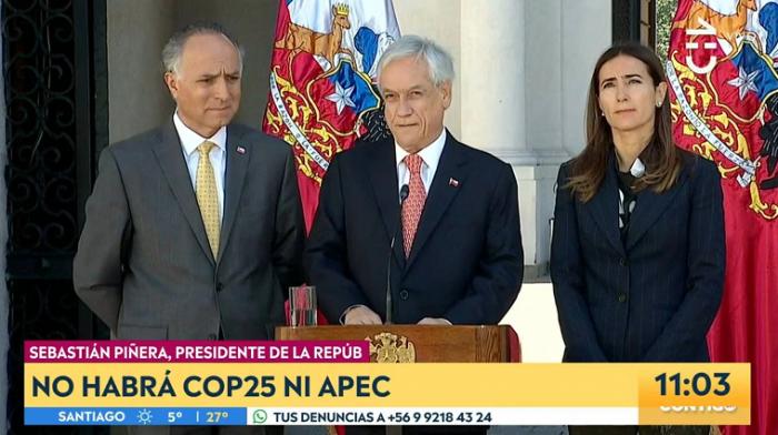 智利总统皮涅拉发表电视讲话,宣布取消11月和12月分别在智利首都圣地亚哥举办的APEC领导人非正式会议和气候大会。APEC(亚洲太平洋经济合作组织) 第二十七次领导人非正式会议原本定于11月16日至17日在智利的圣地亚哥举行。