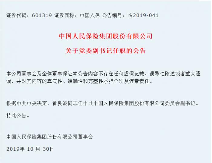10月30日晚间,中国人保(601319.SH)发布公告称,根据中共中央决定,黄良波出任中共中国人民保险集团股份有限公司委员会副书记。