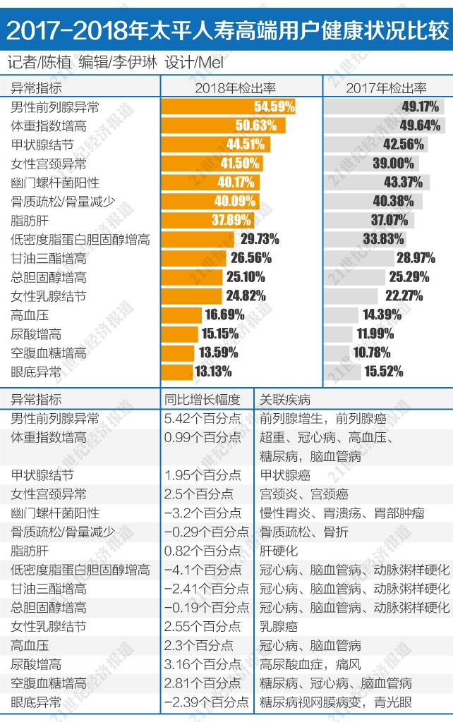 近日,太平人寿通过对去年在爱康集团参加体检的11025位VIP客户的体检结果进行数据分析,发现高净值人群健康状况正呈现6大新发展趋势: