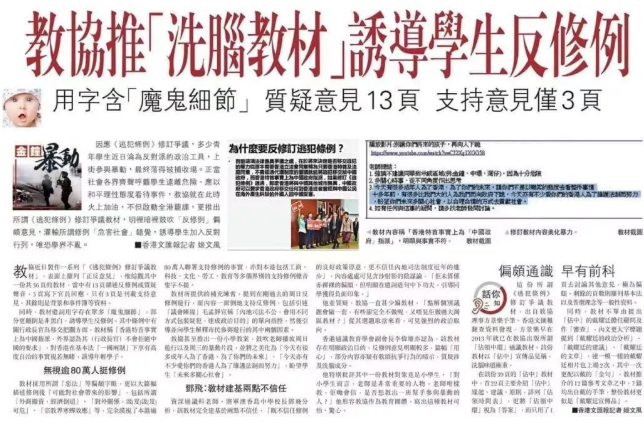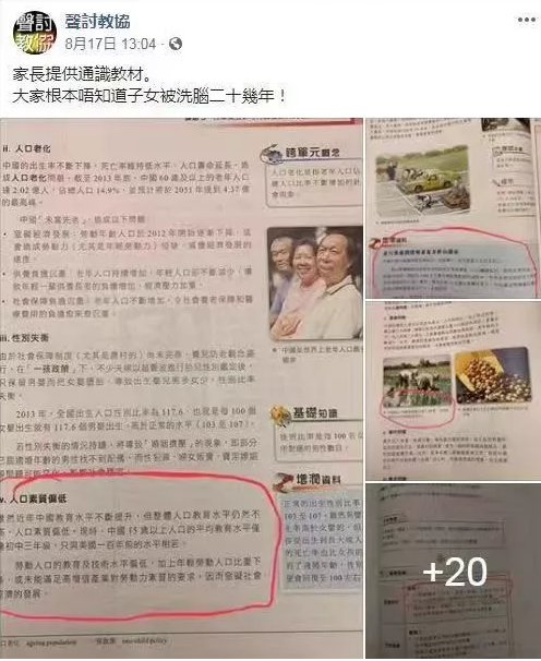 在社交平台脸书上有一个“声讨教协”群组,里面上传了一些香港家长提供的通识课教材图片。香港媒体通过调查发现,一些香港学校的通识教育各类教材常见如下问题:攻击“一国两制”;美化非法“占中”;刻意放大和激化香港与内地矛盾;负面解读内地存在的问题,或者直接丑化;鼓动学生通过“非制度化途径”表达诉求;介绍内地时引用过时的数据;引用典型的西方视角下关于中国话题的负面结论。