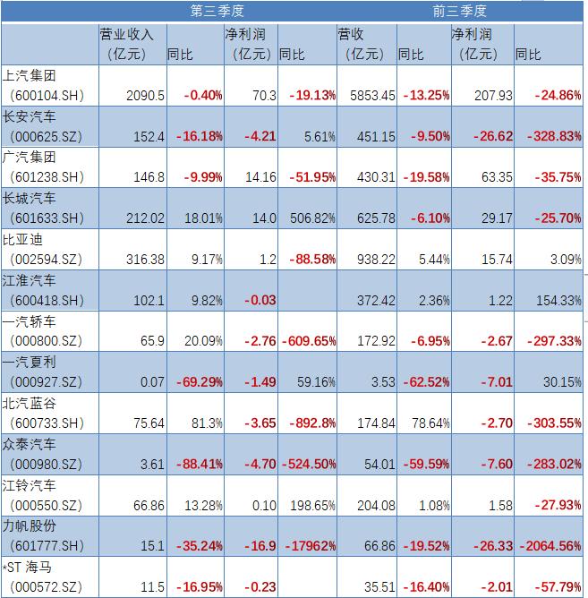 前三季度,13家A股乘用车上市公司中,7家亏损,10家净利润下滑。
