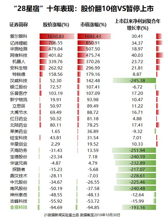 十年间,“28星宿”的总市值从上市首日的1400亿元上涨至4000多亿元,其中,有10家公司市值翻倍,7家公司市值缩水。