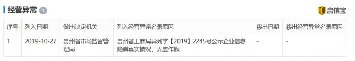 启信宝数据显示,10月27日,华能贵诚信托有限公司被贵州省市场监督管理局列入经营异常名录,原因是“公示企业信息隐瞒真实情况、弄虚作假”。