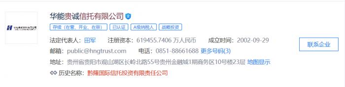 据公开信息显示,中国华能集团因持有华能资本61.22%股份而实际控制了华能贵诚信托,华能贵诚信托于2008年由中国华能集团有限公司子公司——华能资本服务有限公司,在原贵州省黔隆国际信托投资有限责任公司基础上,增资扩股重组而成。