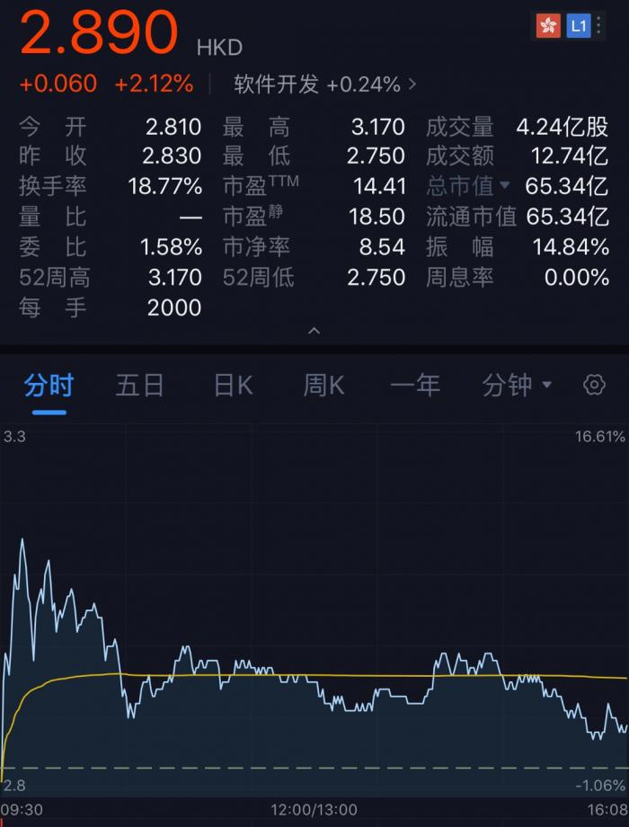 10月31日上午, 中手游(00302.HK)正式在港交所挂牌上市。当天,中手游股价开盘破发,随后迅速拉升,一度冲高至3.17港元,最终报收于2.89港元/股,较2.83港元的发行价上涨2.12%。