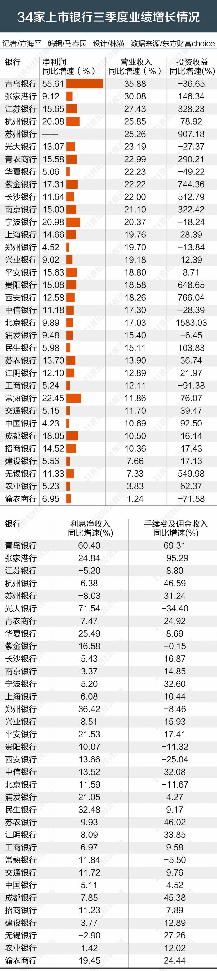 21世纪经济报道记者详细梳理并分析了34家A股上市银行三季报的收入和利润数据发现,所有上市银行均取得业绩正增长,大量中小银行仍保持了较高增速,国有大型银行和资产规模大的股份制银行也保持了稳定增长。