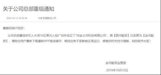 更多的是假冒券商名义开展非法证券活动的,如金河配资,此前叫银河配资,就是假冒银河证券的名义开发展非法证券活动。今年10月12日,该公司发布“关于公司总部重组通知”, 声称公司总部重组并引入外资10亿美元入驻广州并成立“广州金之河科技有限公司”,原【银河配资】已变更为【金河配资】。