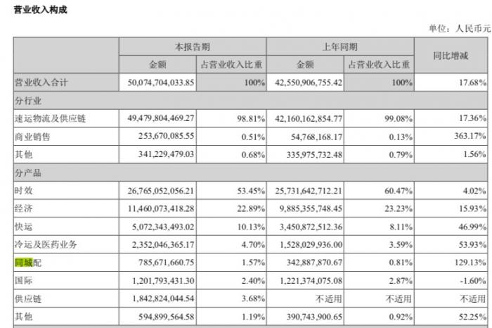 21世纪经济报道记者发现,在独立之前,同城配送业务收入在集团中的贡献占比仍相对较小。2018年和2019上半年两个财年中,占比大约在1-1.5%,相比同样被公司定义为新业务的快运、冷运及医药、国际等业务,的确处在底盘较轻,快速上升态势中。