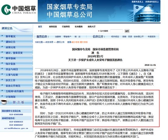 烟草专卖局、国家市场监督管理总局发布《关于进一步保护未成年人免受电子烟侵害的通告》。《通告》明确规定,各类市场主体不得向未成年人销售电子烟。任何组织和个人对向未成年人销售电子烟的行为应予以劝阻、制止。